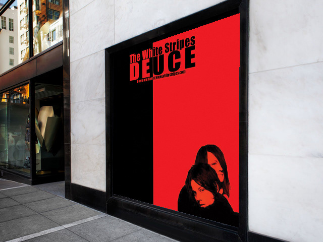 This large poster is advertising the group The White Stripes with their trademark black and red colors.